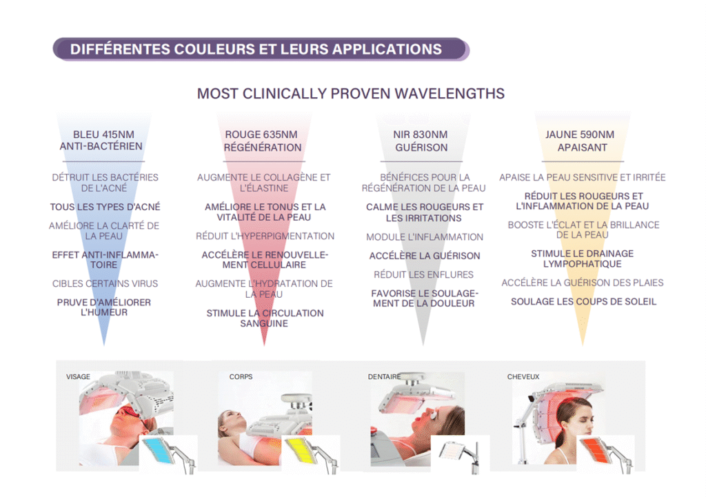 Technologie LED Multi-Spectre pour les Soins Cutanés, la Récupération Médicale & la Thérapie Combinée Rouge | Jaune | Bleu | Infrarouge – Modes Séparés ou Combinés